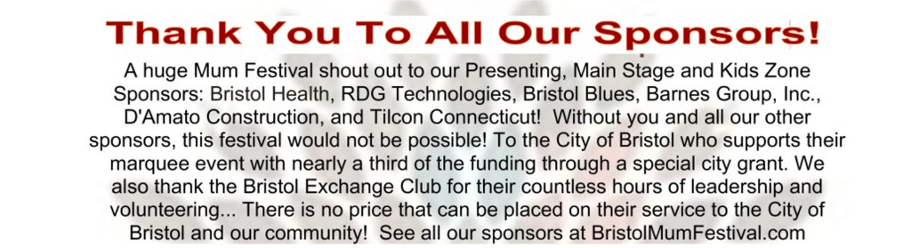 The Mum Festival is under the auspices of the Exchange Club of Bristol, Connecticut, Inc., and its main Benefactor is the City of Bristol Connecticut, Inc.